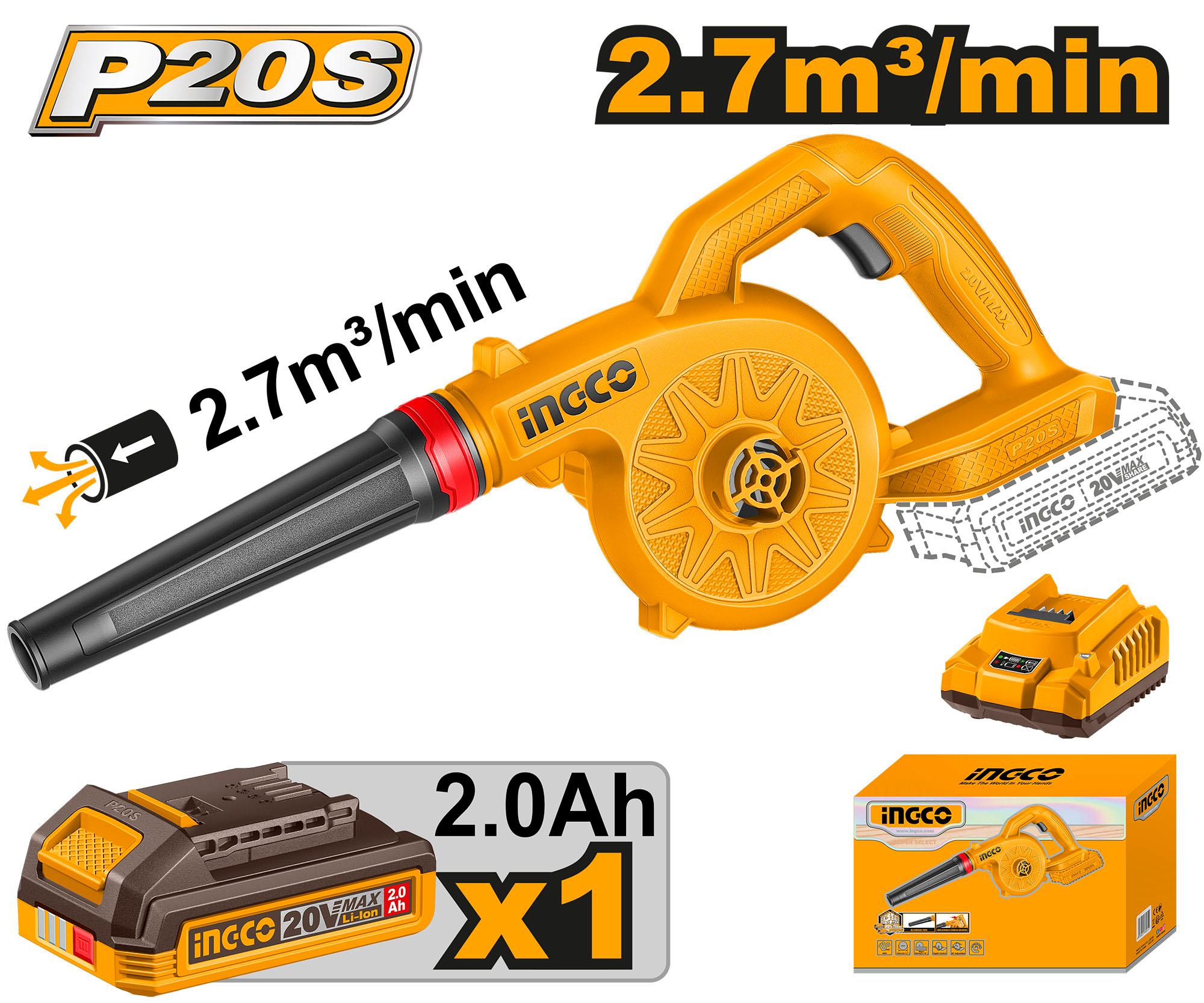 INGCO Cordless Blower, Variable Speed, 0-9000/0-18000 RPM, With Battery & Charger