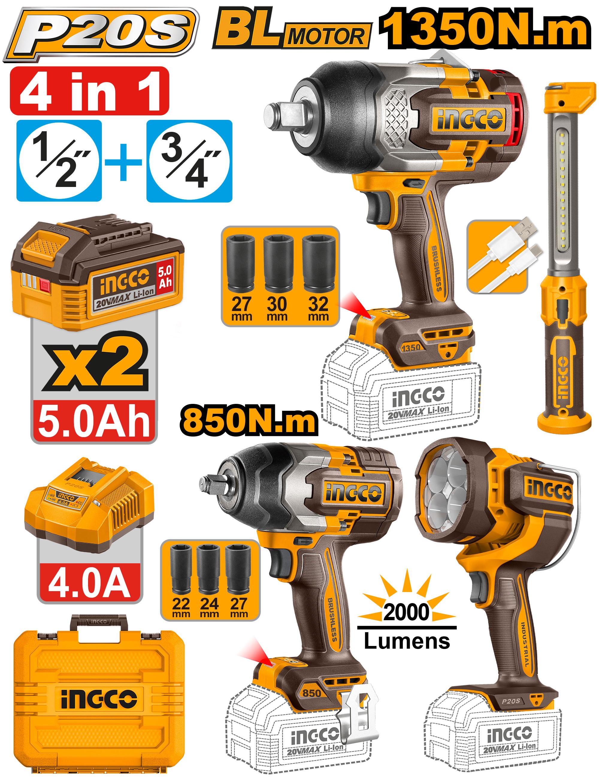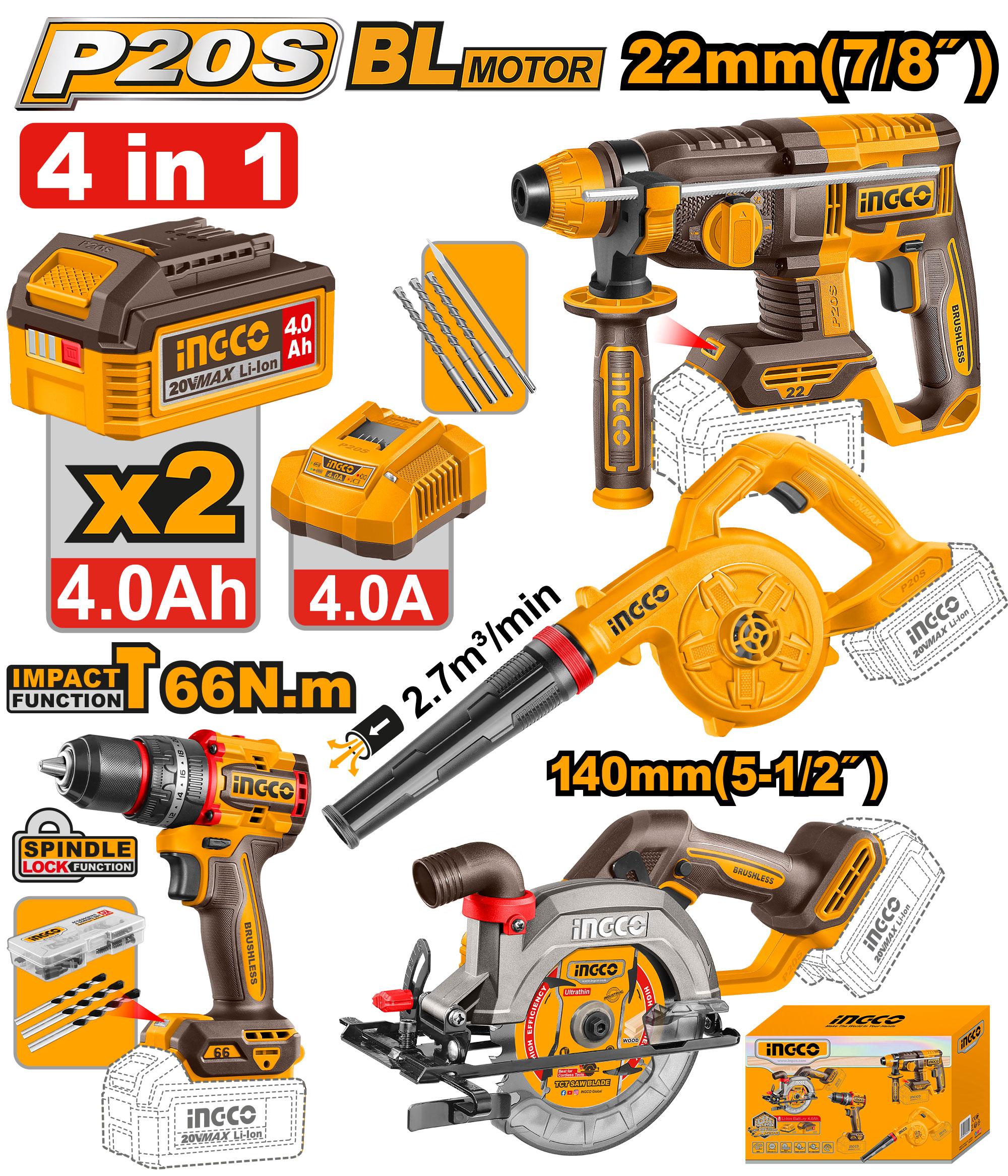 INGCO Cordless Impact Drill, Brushless Motor, 66 Nm, 22+1+1, with Drill Bits, with 2 pcs Batteries and Charger