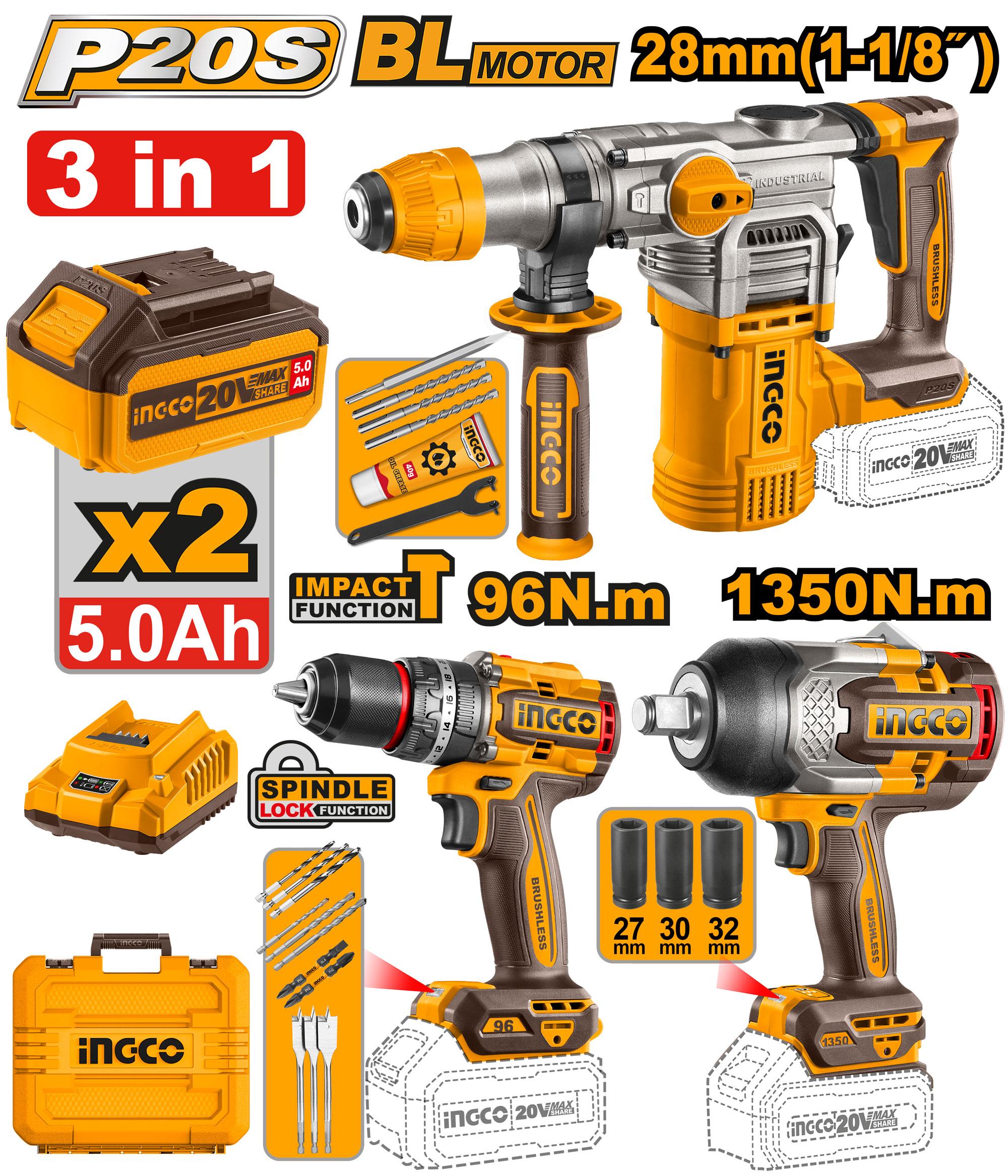 INGCO Cordless Power Tool Combo Kit, Impact Drill Machine & Angle Grinder